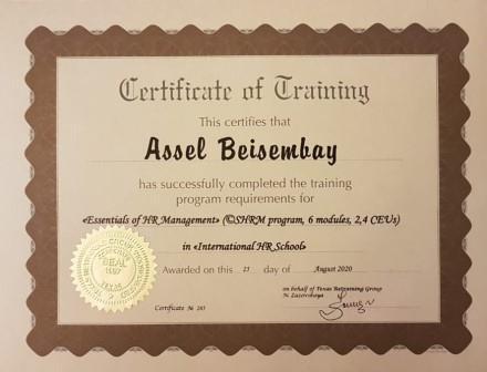Сертификат, выданный казахстанской компанией ASSET HR и американской компанией Texas Retraining GroupДля получения сертификатов необходимо сдать итоговую работу